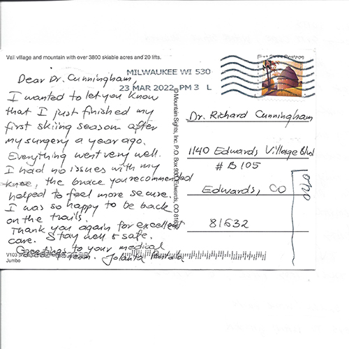 “Dear Dr. Cunningham, you are quite simply the best! I am so thankful that you were able to do my surgery. I was determined to return to Colorado to have my knees done by you and you alone. You have put much joy in my spirit to continue doing all the activities that Colorado has to offer.