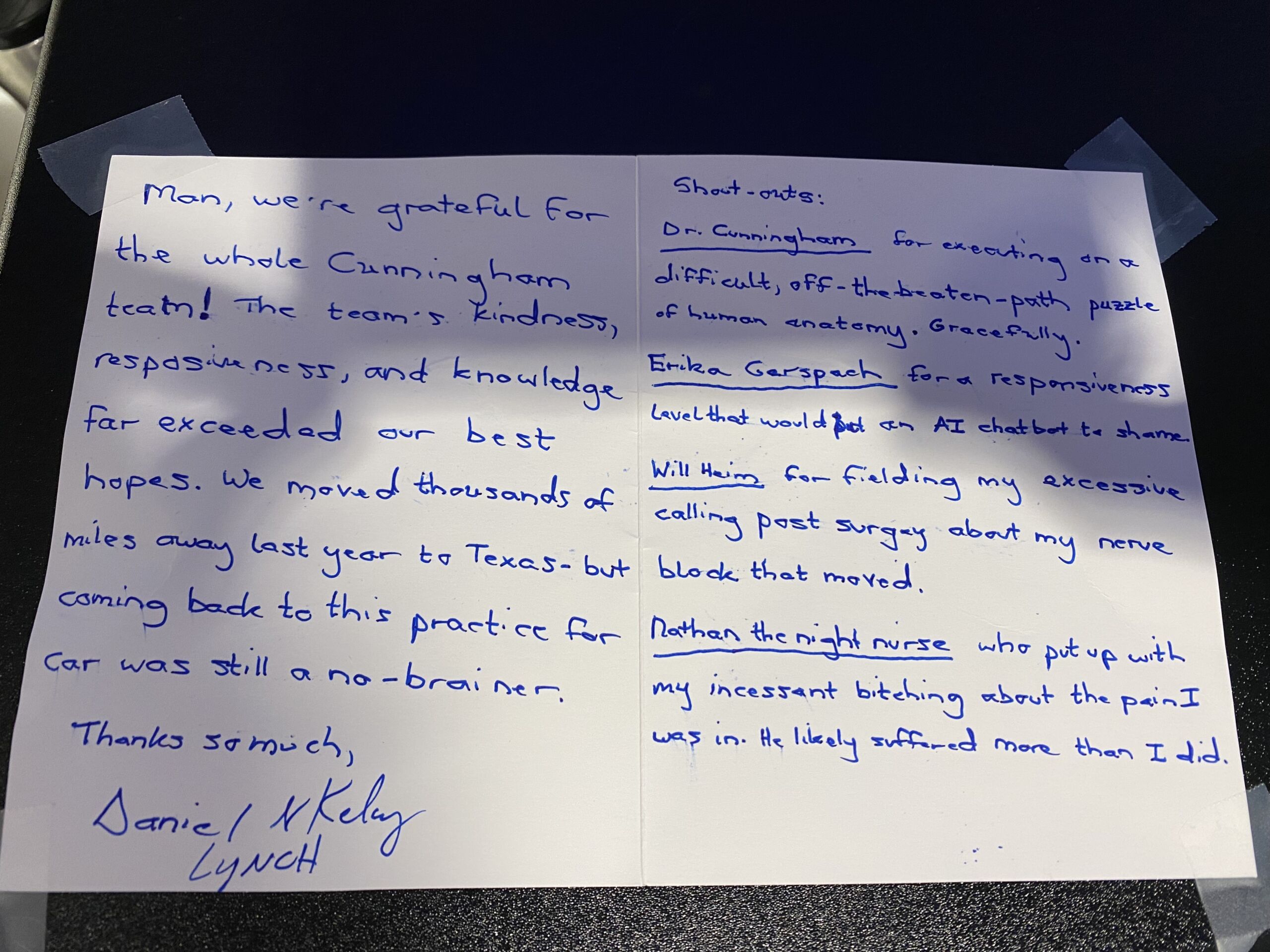 “To Dr. Rick Cunningham, The Best Doctor “In The Knee Joint”..