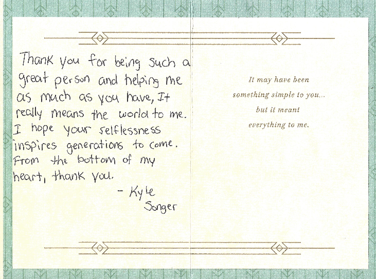 Thank you for being such a great person and helping me as much as you have. It really means the world to me. I hope your selflessness inspires generations to come. From the bottom of my heart, thank you.