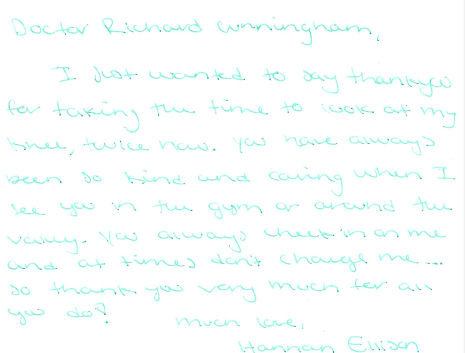 “Thank you so much for fixing my knee, and allowing me to get back to sports my senior year.”