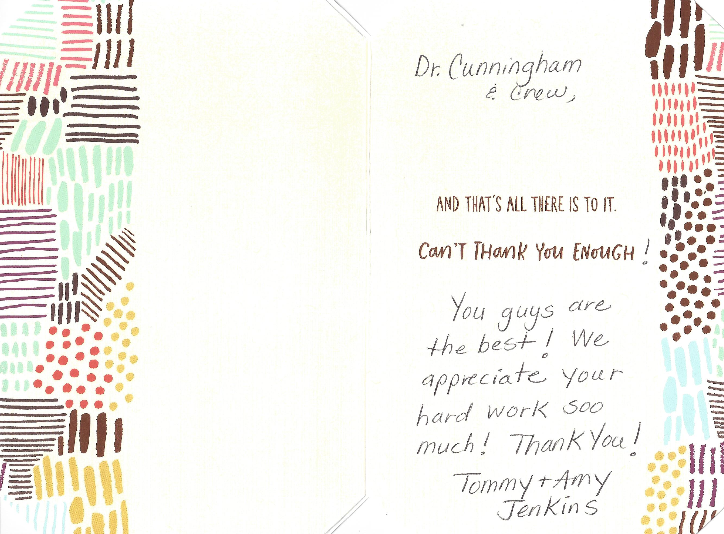 “Dr. Cunningham and Staff, thank you for the great care and kindness from all.”