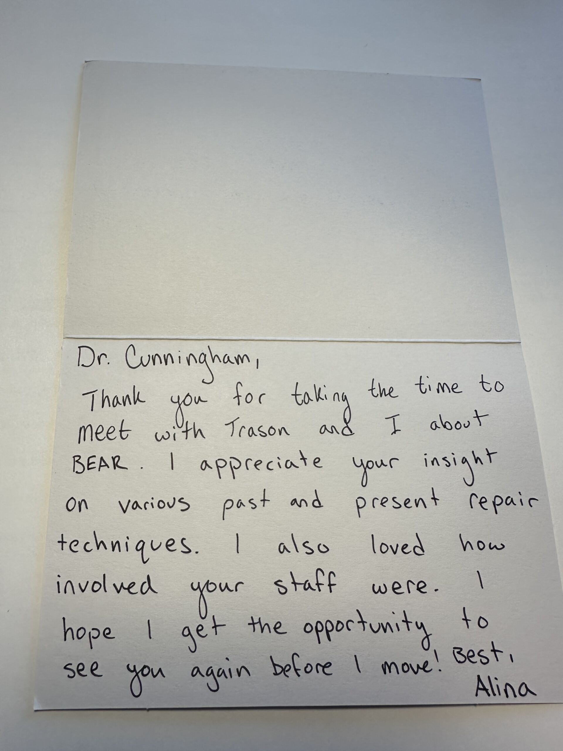Thank you for taking the time to meet with Trason and I about BEAR. I appreciate your insight on various past and present repair techniques. I also loved how involved your staff were. I hope you get the opportunity to see you again before I move!
